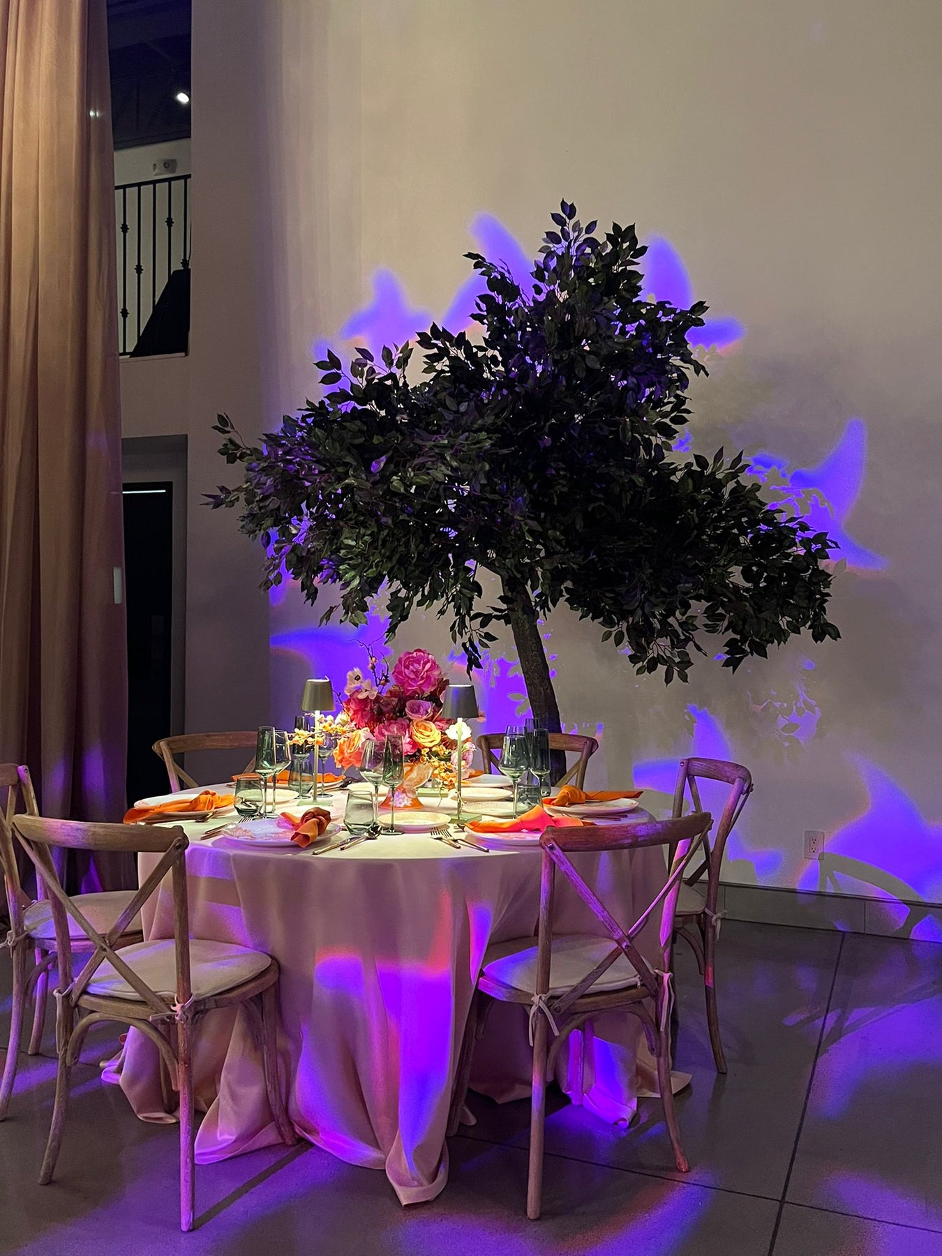 A 10ft artificial Ficus tree with dense green foliage, ideal for wedding decor, providing a romantic, natural touch, displayed indoors among other floral decorations.