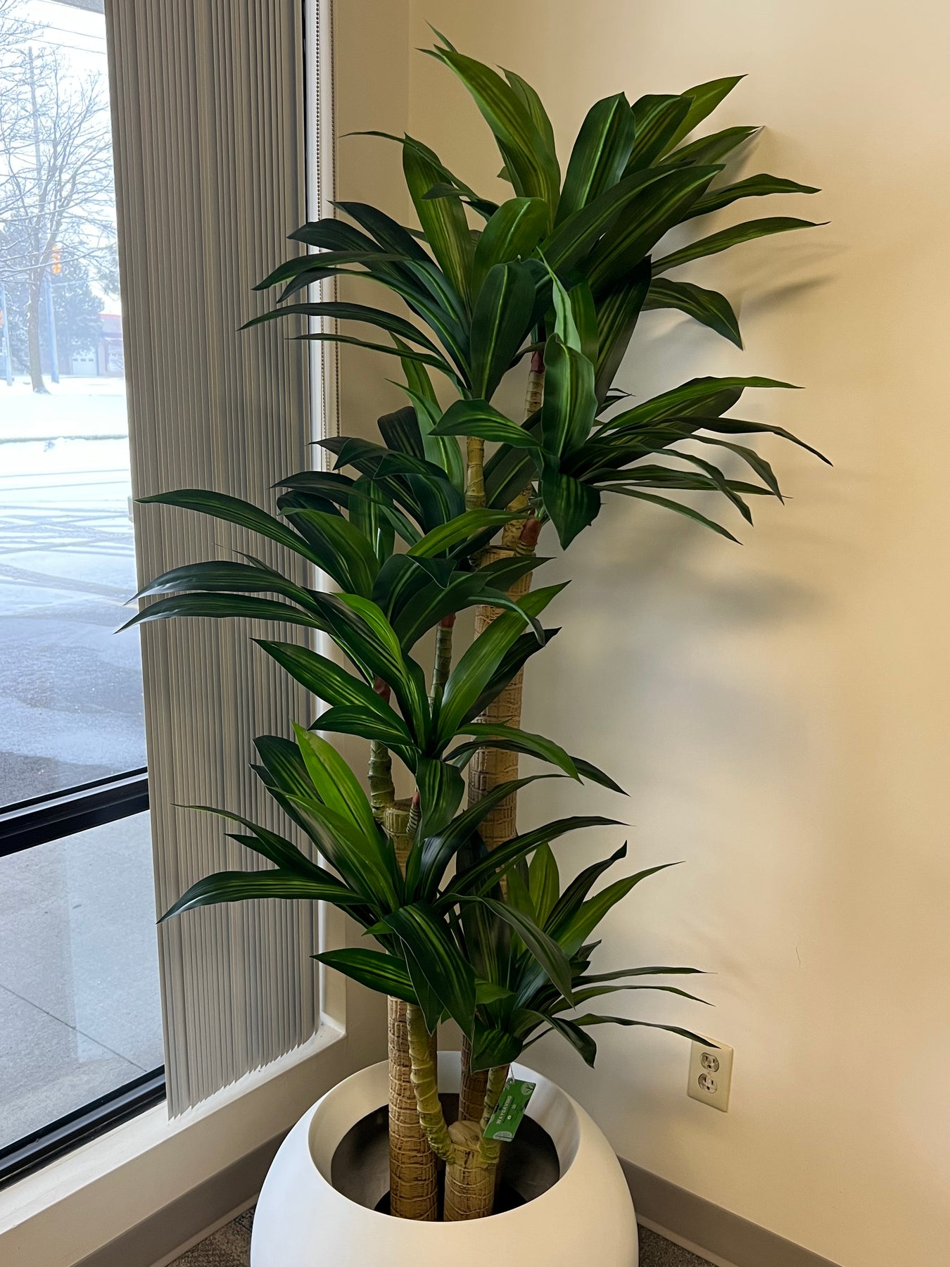 yucca plant in a modern round white planter, positioned near a large window, bringing natural greenery into an indoor space with minimalist decor