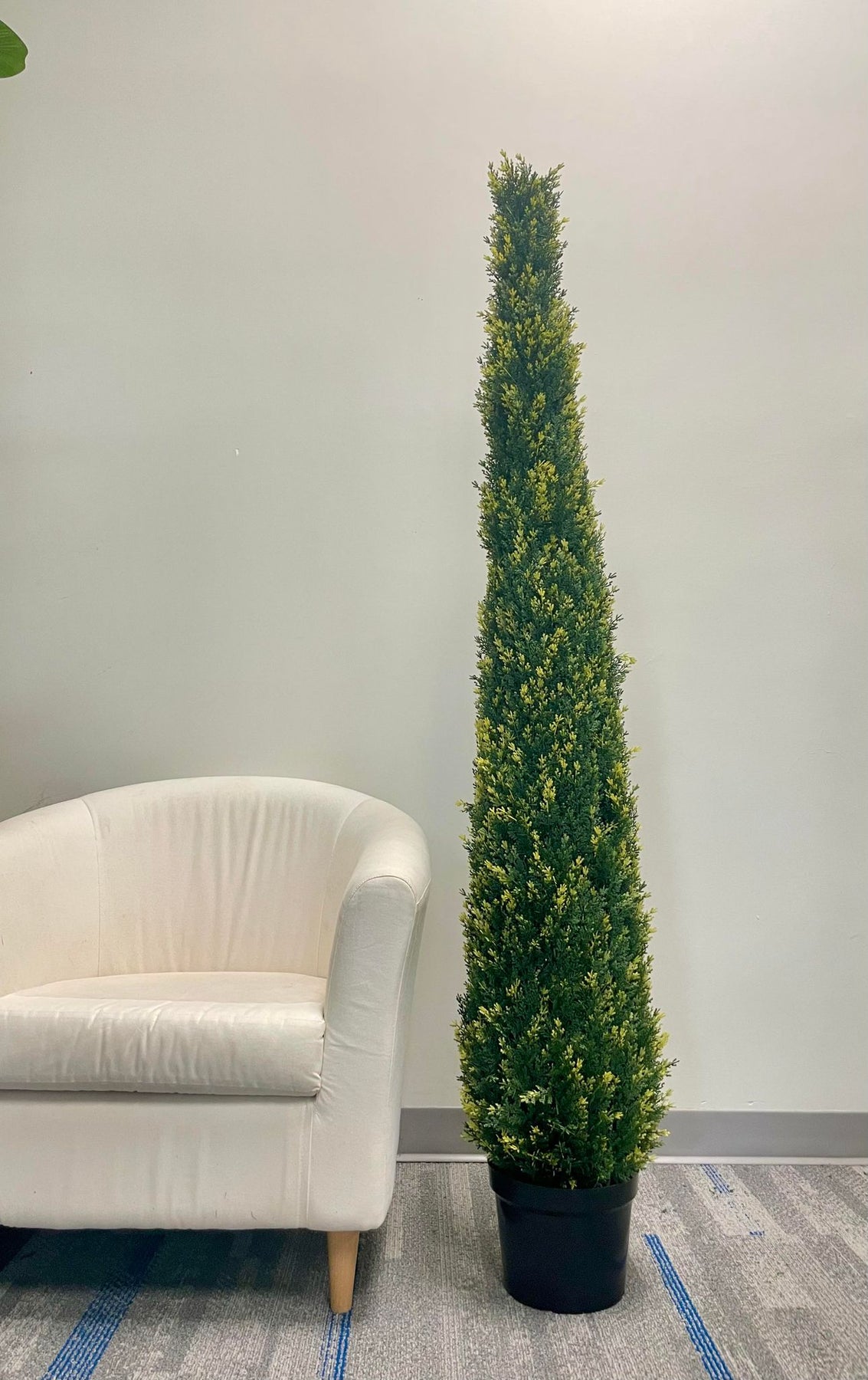Artificial tall evergreen plant in a black pot, featuring lush green foliage with subtle yellow accents, perfect for outdoor or indoor decor