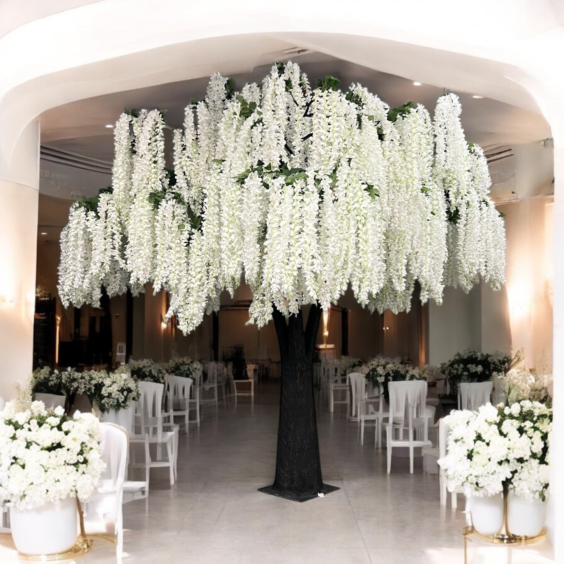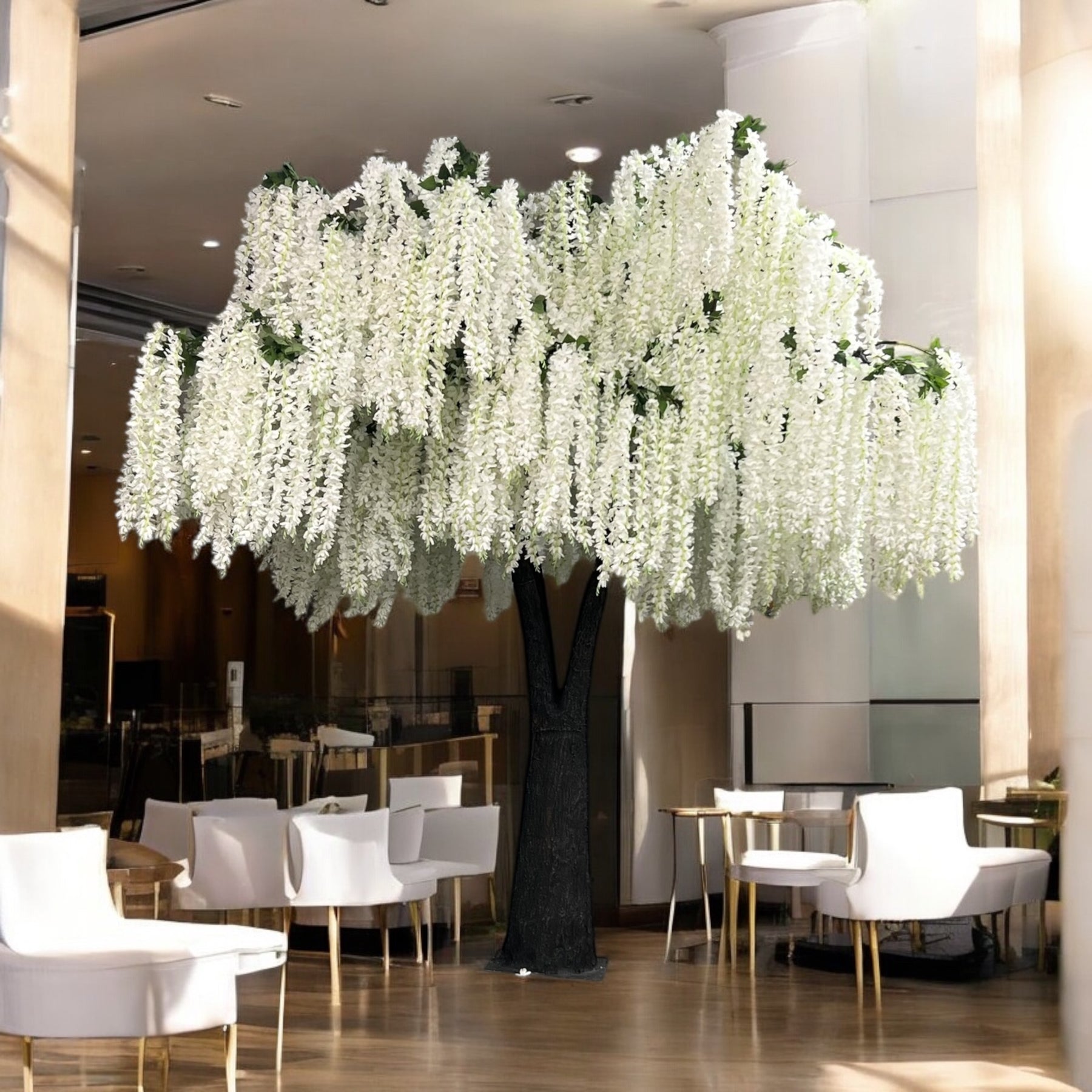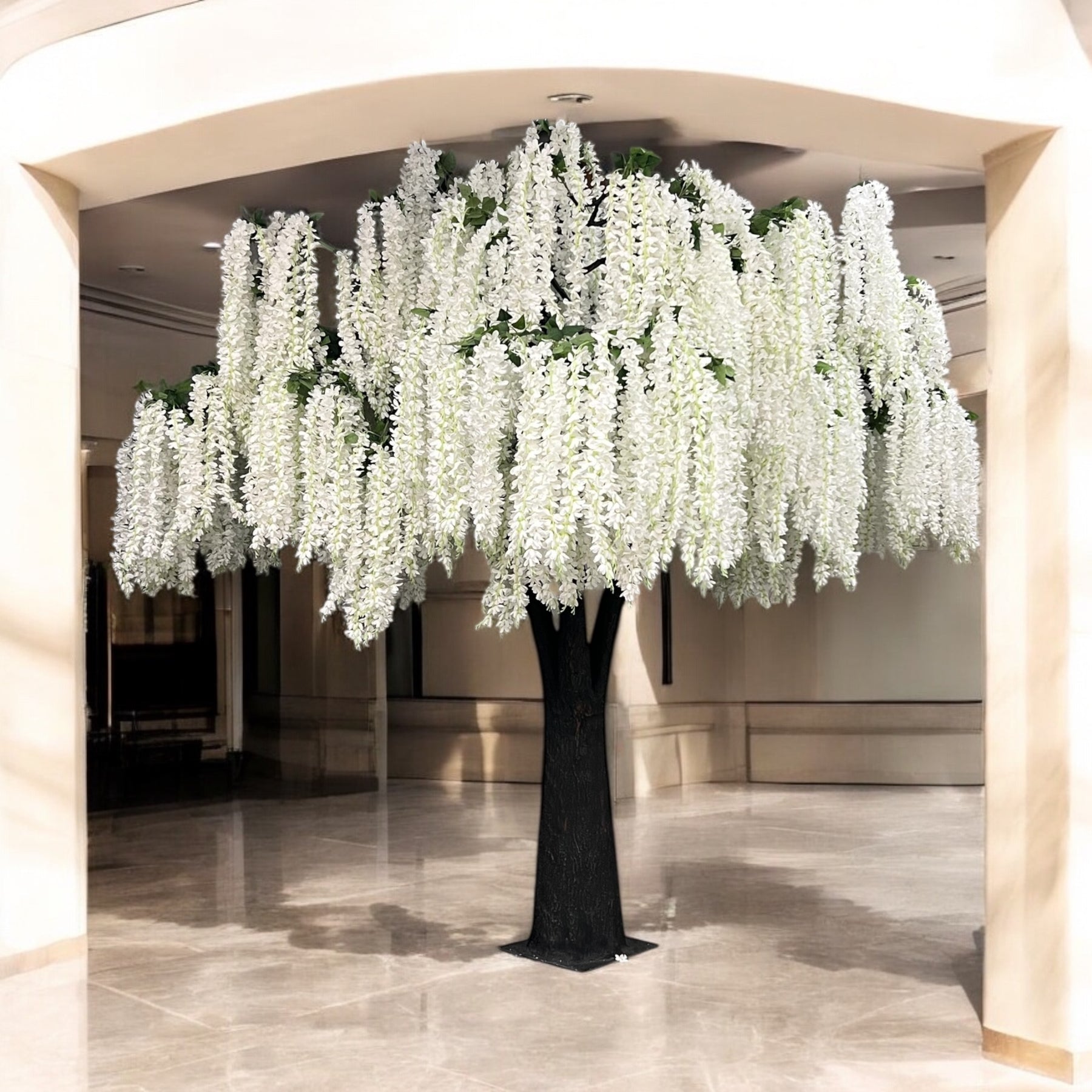 Elevate interiors with the refined beauty of this 15ft artificial white wisteria tree, designed to deliver height, softness, and visual elegance. Featuring flowing white wisteria blooms and a natural-looking trunk, this faux tree creates a striking vertical accent while maintaining a light, graceful presence.