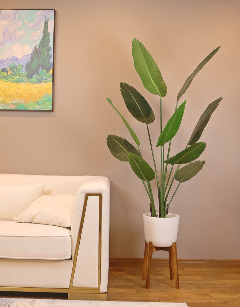 Artificial bird of paradise plant with tall green leaves in a white planter with wooden legs, placed next to a modern cream-colored sofa in a stylish living room with a framed landscape painting on the wall.
