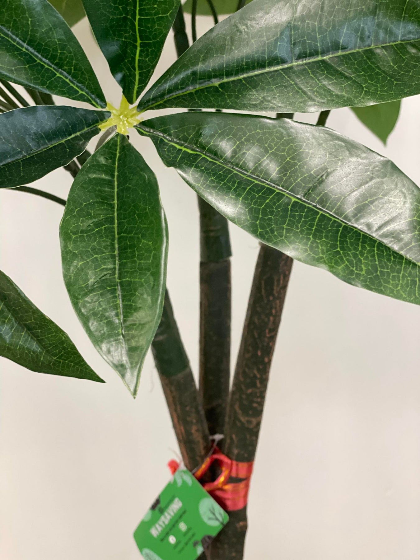 Detailed view of artificial money tree leaves against a textured trunk, highlighting the vibrant green foliage and lifelike appearance, ideal for indoor decor