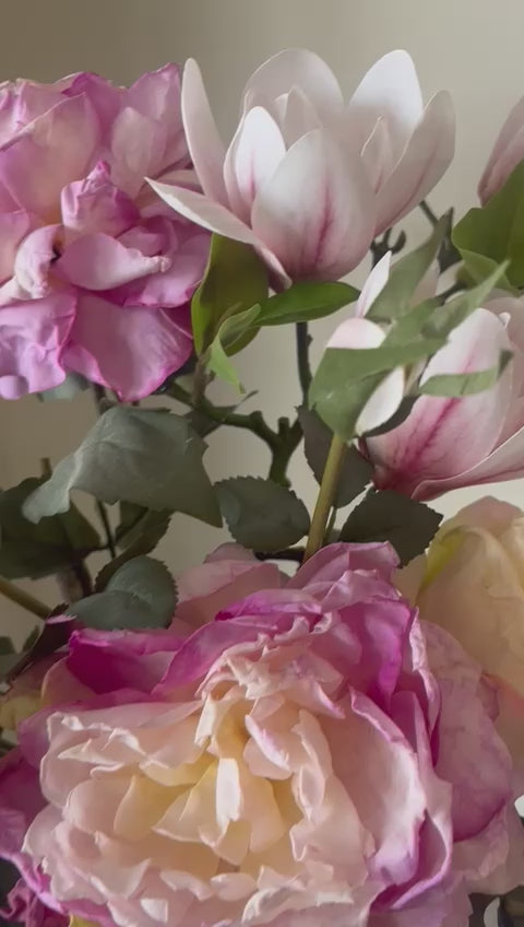 This artificial floral arrangement features lifelike peonies with Magnolia Blossoms in a sleek white textured vase for $70. A perfect centerpiece for any room with zero maintenance.