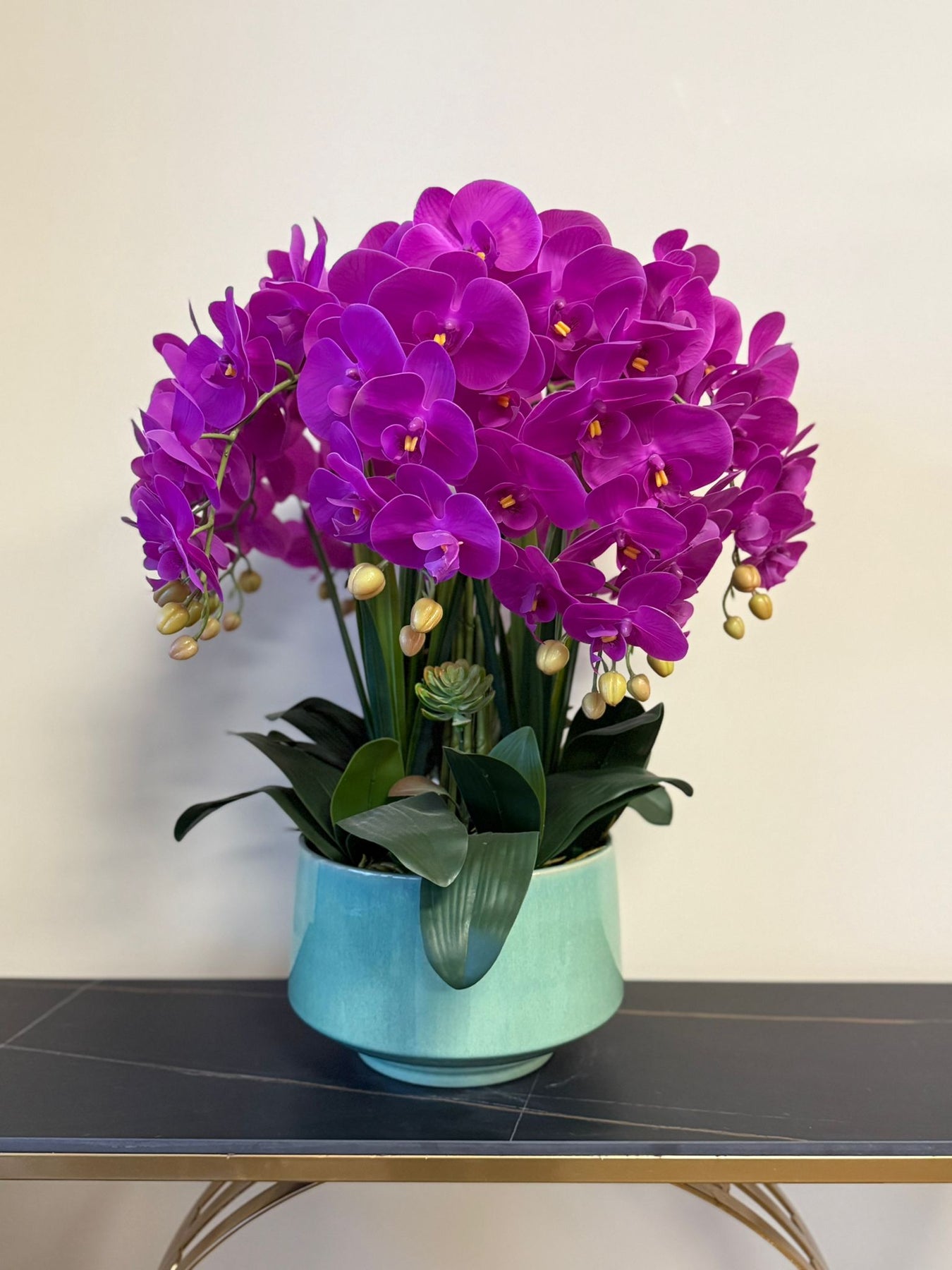 Introducing a breathtaking centerpiece orchid arrangement, meticulously crafted with artificial real-touch flowers to evoke nature’s splendor.