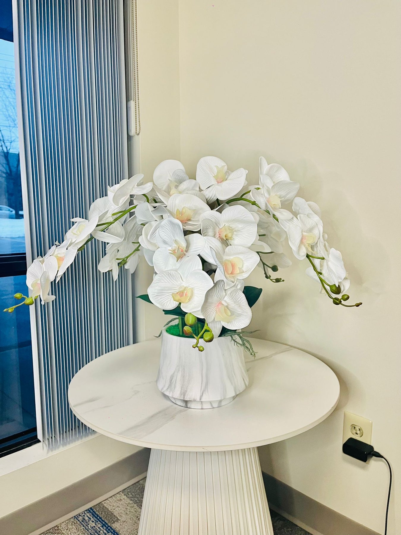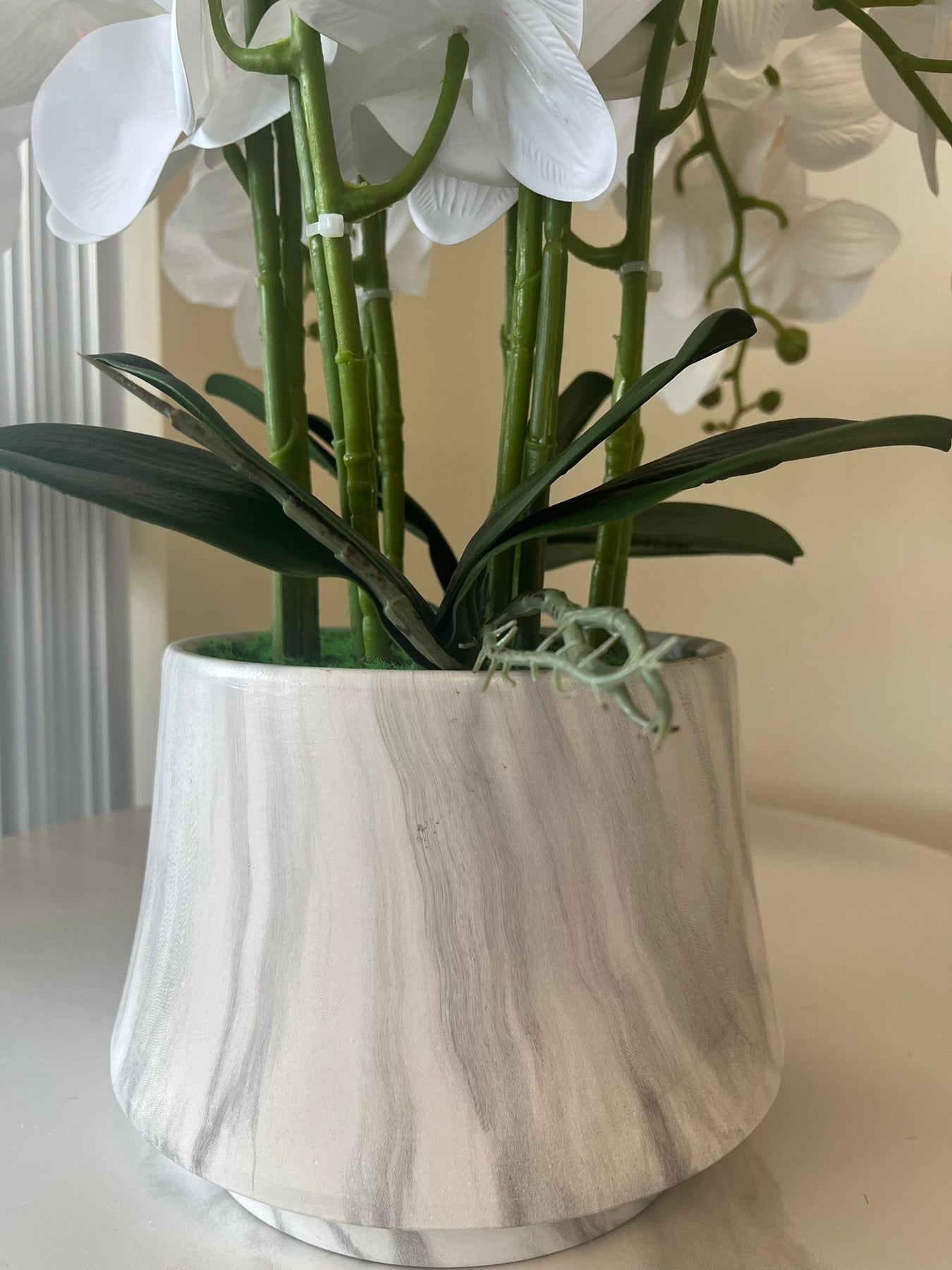 Elevate any space with this Pure White Orchid Arrangement, featuring six elegantly cascading stems adorned with pristine white orchid blooms. The flowers are designed with meticulous attention to detail, creating a realistic, natural appearance that brings a sense of calm and elegance to any room.