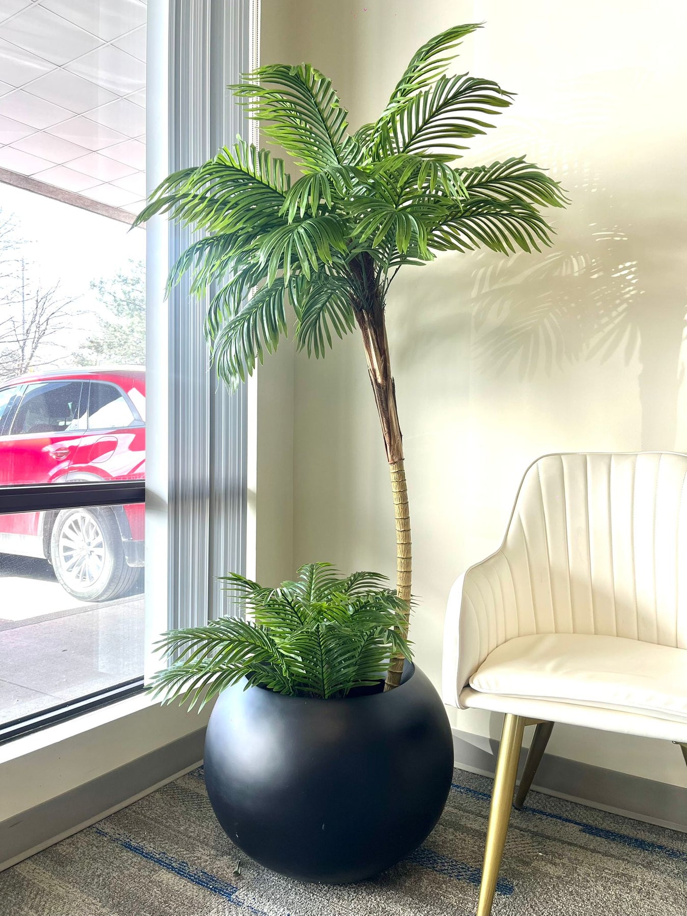 Elegant artificial palm tree with multiple fronds displayed by a large window, adding tropical ambiance to the space.
