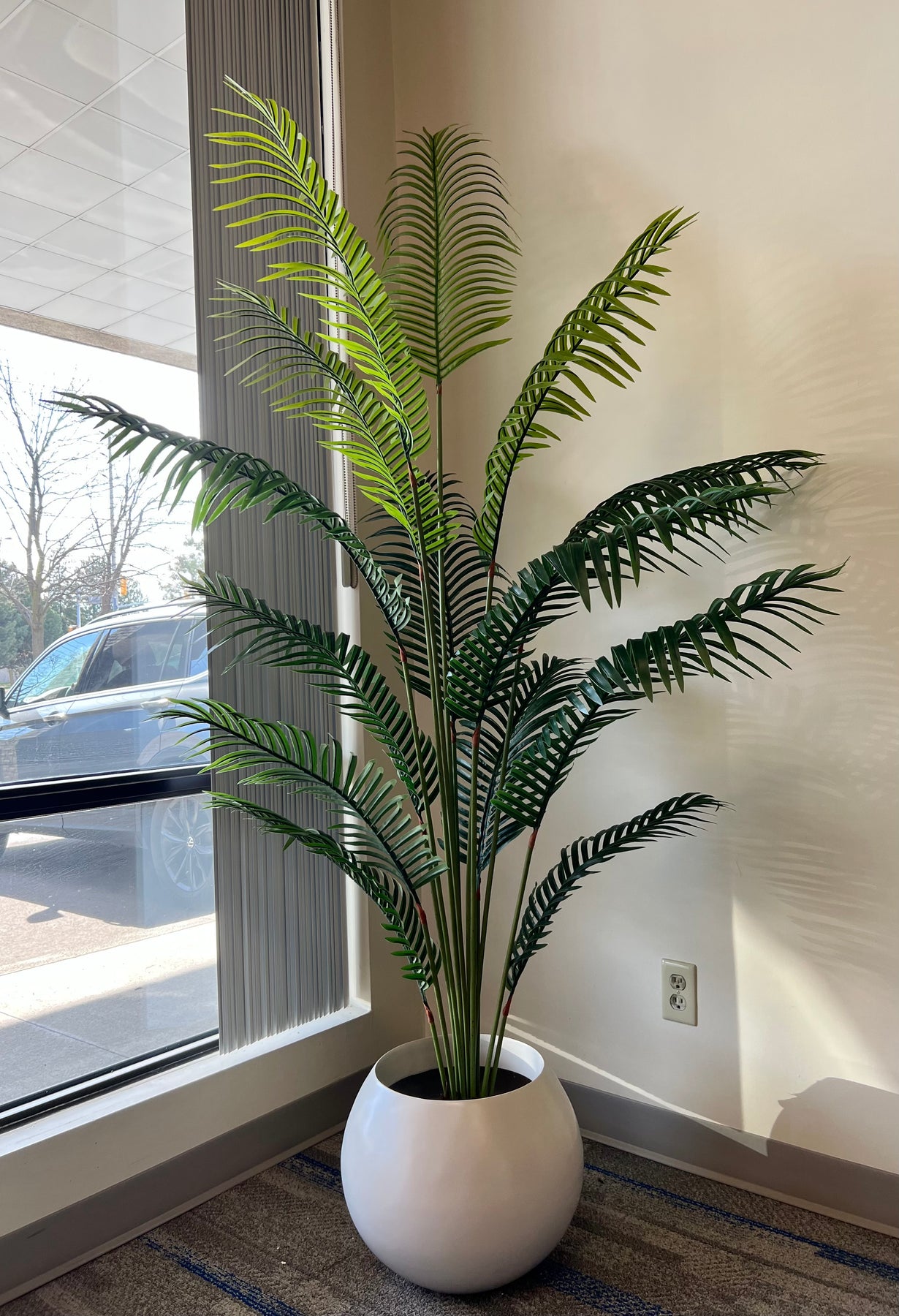 A stylish artificial palm tree placed in a white, round planter, adding a touch of greenery and elegance to this office or living space near a window. The natural light accentuates the realistic appearance of the lush, green fronds, creating a serene and inviting atmosphere.