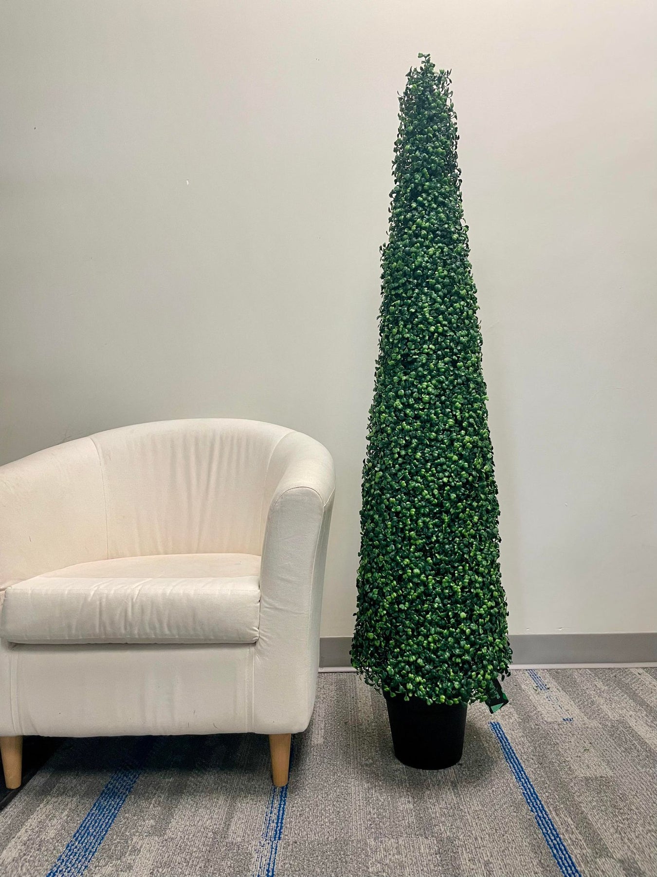 A tall, artificial topiary in the shape of a cone stands in a black pot. The topiary is lush with dense, small green leaves and is placed outside against a textured concrete wall. In the background, there is a view of a building with large windows.