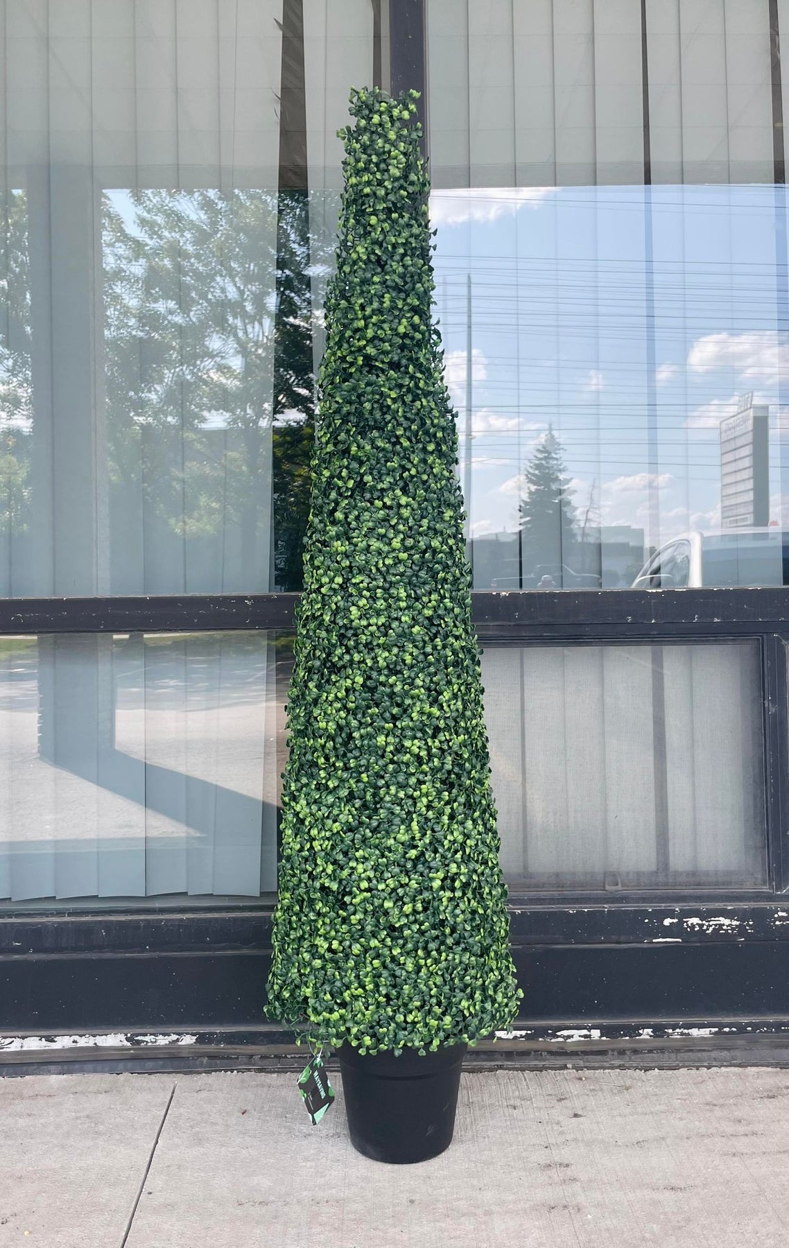 A tall, artificial topiary shaped like a cone stands in a black pot outside a building with large glass windows. The topiary is covered in small, tightly packed green leaves. The reflection of trees and a cloudy sky is visible in the glass behind it.