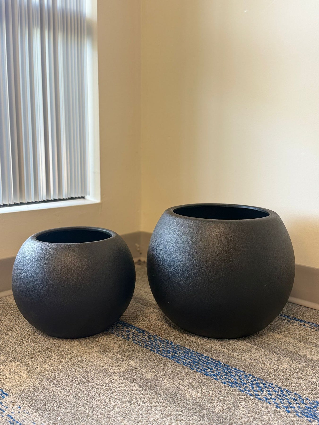 Set of three round ivory planters with a smooth matte finish, displayed indoors near a window. One planter features a trailing artificial green plant for decoration. Are these planters available in other colors?