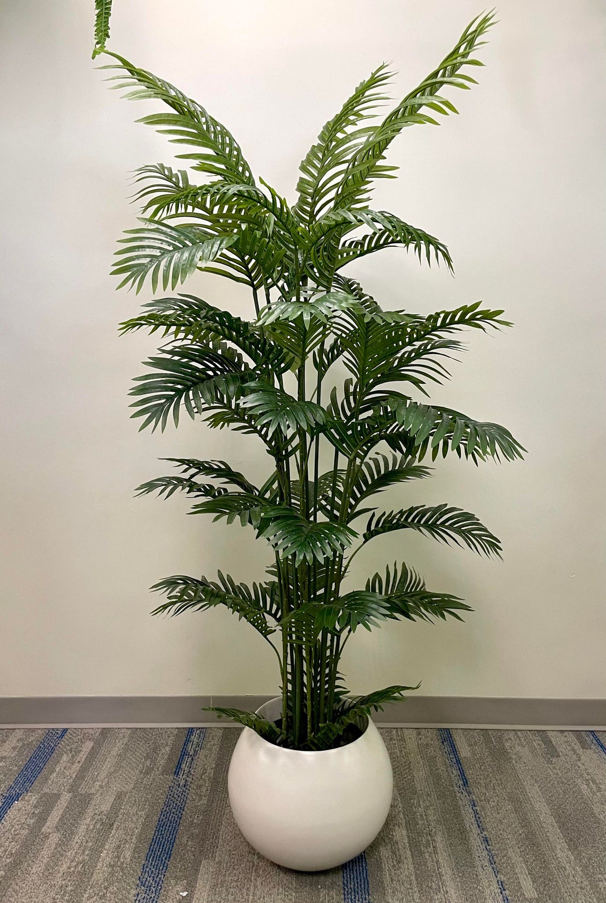 Artificial palm tree in a modern white pot, perfect for adding a tropical touch to indoor spaces with its lush green foliage.